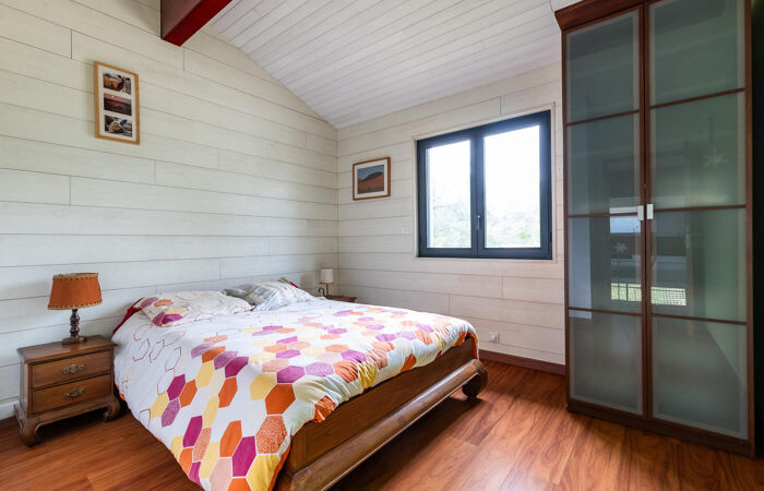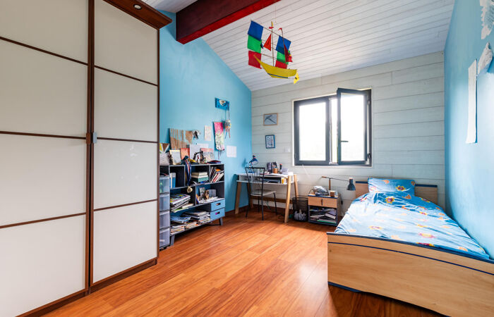 L’étage propose trois chambres, une salle de bains ainsi qu’une salle de jeux.