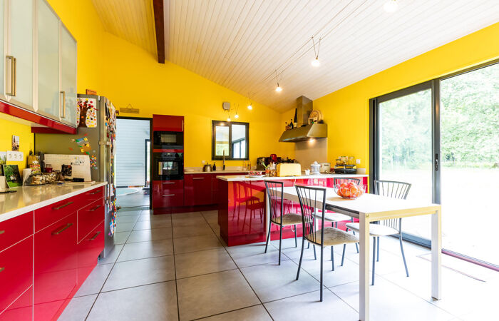 Elle s’ouvre sur une entrée avec placard, puis sur une lumineuse pièce de vie de 70 m² agrémentée d’un insert. La grande cuisine équipée, prolongée par un cellier attenant, offre un espace fonctionnel et convivial.